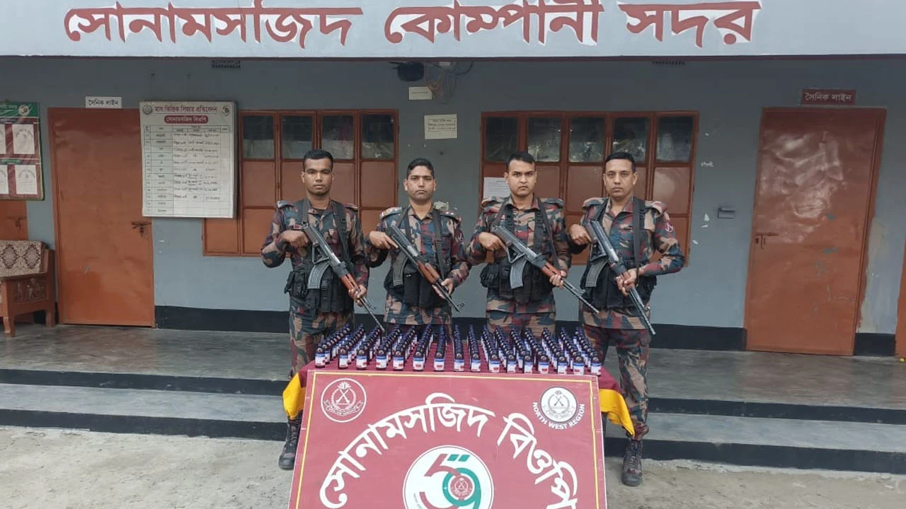 বুধবার গভীর রাতে সোনামসজিদ বিওপি’র একটি বিশেষ টহল দল অভিযান পরিচালনা করে সীমান্ত পিলার ১৮৫/১৭-এস হতে আনুমানিক ৪০ গজ বাংলাদেশের অভ্যন্তরে মালিকবিহীন ১৫০ বোতল ভারতীয় চকো প্লাস সিরাপ জব্দ করে বাহিনীটি। এই চকো প্লাস সিরাপ ফেনসিডিলের বিকল্প হিসেবে সেবন করছে মাদকসেবিরা।