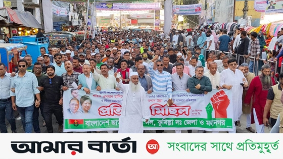 ইনকিলাব মঞ্চের আহ্বায়ক ও ঢাকা-৮ আসনে সম্ভাব্য স্বতন্ত্র প্রার্থী শরিফ ওসমান হাদি ও চট্টগ্রাম-৮ আসনের বিএনপি মনোনীত প্রার্থী এরশাদ উল্লাহর ওপর সন্ত্রাসী হামলার প্রতিবাদে কুমিল্লায় বিক্ষোভ মিছিল করেছেন দক্ষিণ জেলা ও মহানগর বিএনপি।