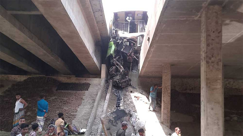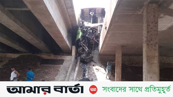 “এতে ঘটনাস্থলেই বাসের চালক ও তার সহকারী নিহত হন এবং হাসপাতালে নেওয়ার পথে আরও এক জনের মৃত্যু হয়।”