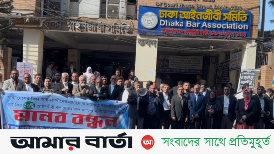 বৃহস্পতিবার (১১ ডিসেম্বর) সকালে ঢাকা আইনজীবী সমিতি ভবনের সামনে এই মানববন্ধন করেন আইনজীবীরা।
