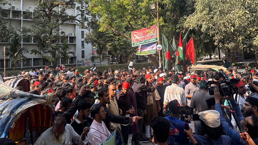 ইনকিলাব মঞ্চের মুখপাত্র ও ঢাকা-৮ আসনের সম্ভাব্য স্বতন্ত্র প্রার্থী ওসমান হাদিকে গুলি করে হত্যাচেষ্টায় জড়িত সন্ত্রাসীদের গ্রেপ্তারসহ তিন দফা দাবিতে স্বরাষ্ট্র উপদেষ্টার কার্যালয় ঘেরাওয়ের উদ্দেশ্যে ছাত্র-জনতাকে নিয়ে মার্চ শুরু করেছে ঢাকা বিশ্ববিদ্যালয় কেন্দ্রীয় ছাত্র সংসদ (ডাকসু)।