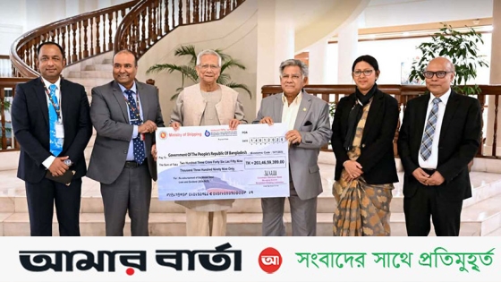 রাষ্ট্রীয় অতিথি ভবন যমুনায় প্রধান উপদেষ্টার কাছে চেক হস্তান্তর করেন নৌপরিবহন উপদেষ্টা এম সাখাওয়াত হোসেন ও বিএসসি ব্যবস্থাপনা পরিচালক কমডোর মাহমুদুল মালেক।