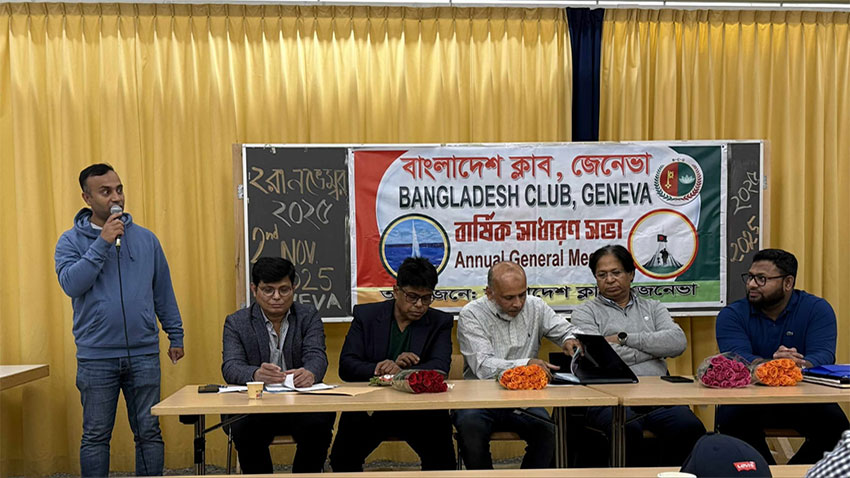 সংগঠনের ত্রিবার্ষিক কার্যনির্বাহী কমিটি গঠন ও বার্ষিক সাধারণ সভা–২০২৫ রোববার (তারিখ) জেনেভার স্থানীয় এক কমিউনিটি হলে উৎসবমুখর পরিবেশে অনুষ্ঠিত হয়। অনুষ্ঠানে সভাপতিত্ব করেন বিদায়ী সভাপতি হারুন রশিদ এবং পরিচালনা করেন সাধারণ সম্পাদক নুরুল ইসলাম।