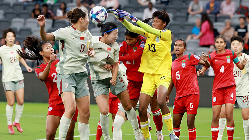 বাংলাদেশের গোলপোস্টের সামনে আজ ‘চীনের মহাপ্রাচীর’ বনে যান মিলি আক্তার। ছবি: সংগৃহীত